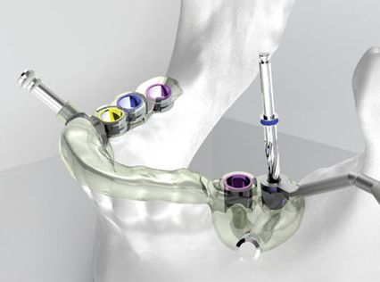 据主刀医生郑晓玲主任介绍,刘阿姨采用的是数字化种植技术,术前在电脑上重建口腔三维机构,设计种植方案,确定种植点位,将这些信息复制到一个种植定位板上,通过3D打印出来,再将定位板安装到牙床上。“手术的时候直接沿着设计好的小孔种牙即可。”
